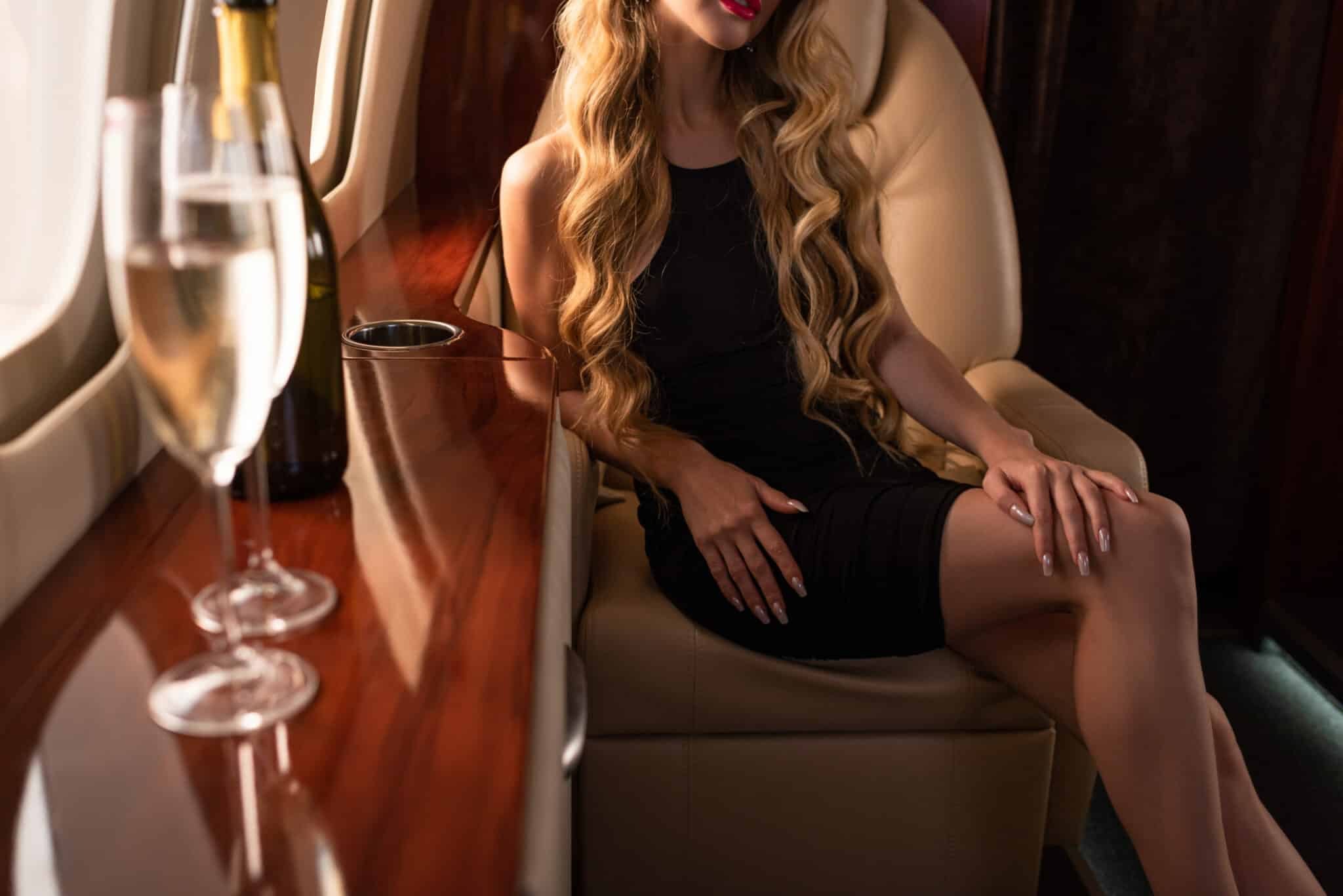cropped view of glamorous woman with champagne sitting in plane